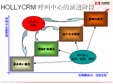 其次,我們認(rèn)為企業(yè)呼叫中心的建設(shè)不可能一次到位,而是一個持續(xù)改進和不斷完善的過程。企業(yè)建設(shè)呼叫中心將是一個分階段分步驟的建設(shè)過程,將在其規(guī)劃的呼叫中心戰(zhàn)略的指引下和呼叫中心架構(gòu)、流程和績效的支撐上會經(jīng)歷基本核心服務(wù)、增強擴展服務(wù)、客戶關(guān)系管理和策略性服務(wù)等幾個主要的階段,這就需要前期做好整體規(guī)劃,然后分階段實施,確保前期投資在后期依然可用就非常重要了,具體如下圖所示: