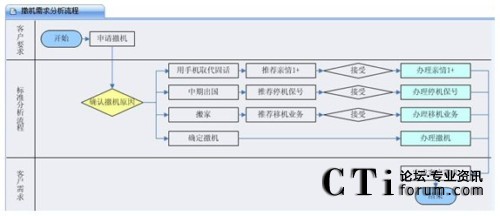 客戶呼入之后,座席人員要做的第一件事情就在IT系統(tǒng)的支持下先去捕獲客戶訴求,不用擔(dān)心座席會(huì)混淆相似的業(yè)務(wù)類型,因?yàn)楹艚兄行尼槍?duì)典型的業(yè)務(wù)訴求會(huì)做出非常詳盡的引導(dǎo)流程,相似的或者關(guān)聯(lián)的業(yè)務(wù)類型在此流程中會(huì)體現(xiàn)出來(lái),座席人員可以點(diǎn)擊,快捷地出入于各業(yè)務(wù)類型的引導(dǎo)圖,通過比較、判斷,最終定位出客戶真正訴求。例如下文客戶呼入本來(lái)想做“撤機(jī)”業(yè)務(wù),通過業(yè)務(wù)引導(dǎo)圖,最終定位到了客戶的真正訴求,辦理了停機(jī)保號(hào)業(yè)務(wù)或者移機(jī)業(yè)務(wù)。