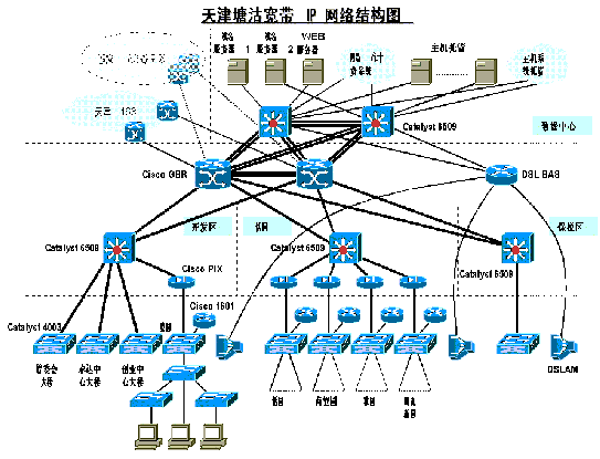 除以上三層之外,在塘沽電信局將建立一個(gè)數(shù)據(jù)中心,由兩臺Cisco Catalyst6509第三層交換機(jī)為數(shù)據(jù)中心提供數(shù)據(jù)交換及路由。接入的DSLAM設(shè)備,小區(qū)內(nèi)的樓層交換機(jī)及用戶前端設(shè)備(CPE)也屬于接入層。接入層主要為最終用戶提供多種寬帶接入方式。