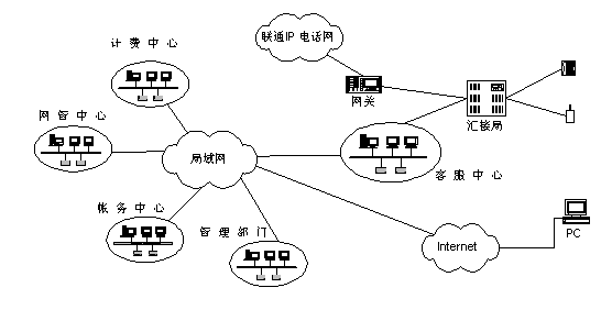聯(lián)通北京分公司將客戶服務系統(tǒng)與現(xiàn)有計費、營業(yè)、帳務系統(tǒng)進行組織,形成了一個有機的結(jié)合體,能夠充分發(fā)揮出現(xiàn)有系統(tǒng)的優(yōu)勢。客戶服務系統(tǒng)從營業(yè)帳務系統(tǒng)提取相關用戶資料,建立客戶服務的系統(tǒng)資料庫,從計費系統(tǒng)提取相關用戶話費資料等供查詢使用。同時客服系統(tǒng)還將與北京聯(lián)通現(xiàn)有的計費、營業(yè)、帳務、網(wǎng)管等相關系統(tǒng)以及Internet相連,提供業(yè)務處理和用戶自助服務等業(yè)務。本客服中心通過2對路由器和DDN專線與聯(lián)通北京分公司現(xiàn)有的局域網(wǎng)(包括管理部門、網(wǎng)管中心、計費中心、帳務中心等相關系統(tǒng))連接,并通過該局域網(wǎng)訪問Internet。