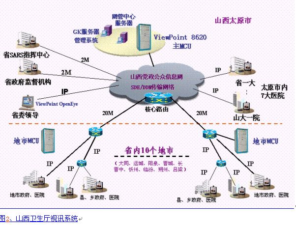 在山西省抗擊非典的關(guān)鍵時期,為了解決非典信息溝通不暢,資源整合不夠等問題,山西省衛(wèi)生廳緊急組建視頻會議網(wǎng)絡(luò),要求能夠容納非典防治指揮中心、省疾病會議控制中心、省一大、省兒童醫(yī)院、山大一院、山大二院及衛(wèi)生廳領(lǐng)導、省委領(lǐng)導辦公室等十幾個非典防治重要部門,從整個政務(wù)往來看,系統(tǒng)要求具有高度穩(wěn)定性、良好的音視頻效果以及方便易用。經(jīng)測試,采用華為技術(shù)有限公司的ViewPoint