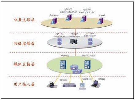 VV-SYS解決方案由用戶接入層、媒體交換層、網(wǎng)絡(luò)控制層及業(yè)務(wù)支撐層四個(gè)層次構(gòu)成,如下圖所示。