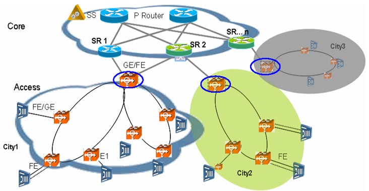 綜合接入主要關注語音和少量寬帶業(yè)務和專線,上行接口一般是E1和FE/GE。傳統(tǒng)窄帶語音業(yè)務、TDM專線等或MSAN使用于窄帶交換機組網(wǎng)的時候采用E1上行方式,其它時候采用FE/GE上行。接入層面采用的承載網(wǎng)設備必須同時能夠支持E1和FE/GE接入,因此承載網(wǎng)設備必須具備多業(yè)務傳輸特性,傳統(tǒng)SDH設備,傳統(tǒng)LANSwitch設備無法滿足組網(wǎng)需求。