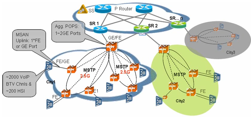 MSAN已經(jīng)逐漸成為基于IP架構的下一代電信網(wǎng)建網(wǎng)的主要接入方式,近幾年越來越多的固網(wǎng)運營商普遍采用綜合接入(MSAN)建網(wǎng)模式,如英國的最大固網(wǎng)運營商英國電信的21CN網(wǎng)絡,中國的最大固網(wǎng)運營商中國電信、中國網(wǎng)通,巴西的最大固網(wǎng)運營商Telemar等。而MSTP單一平臺具備支持MSAN接入的所有業(yè)務的承載要求,且成本最低。華為公司MSTP設備具有強大的數(shù)據(jù)接入?yún)R聚及傳送特性,并通過Metro