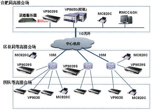 為滿足安徽省煙草合肥市公司日常工作會議、集中培訓、遠程匯報等工作業(yè)務需求,同時為應對突發(fā)事件提供可靠可行的交互平臺,實現(xiàn)多地點、遠距離的視頻、音頻和數(shù)據(jù)的互通交流。深圳市金華威數(shù)碼科技有限公司工程師建議新建的視訊系統(tǒng)采用高清的視頻會議組網(wǎng)模式,其中市局、三縣與區(qū)局、所隊及營銷部所有會場節(jié)點建設高清視頻會議系統(tǒng)。