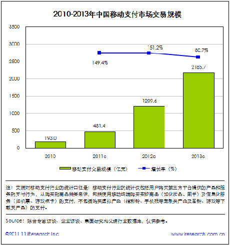 艾瑞咨詢(xún)數(shù)據(jù)顯示,截至2011年底,中國(guó)移動(dòng)支付交易規(guī)模總額將達(dá)到481.4億元,同比增長(zhǎng)149.4%,整體呈現(xiàn)爆發(fā)式的增長(zhǎng)態(tài)勢(shì)。艾瑞預(yù)計(jì),中國(guó)移動(dòng)支付交易規(guī)模將在2013年底超過(guò)2000億元。