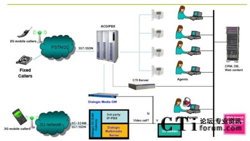 那么如何快速的實現(xiàn)3G IVVR的這些功能呢?林克海德愿意幫助您一起完成這項工作,基于Dialogic產(chǎn)品的全力支持,您可以實現(xiàn)web頁面到3G手機(jī)的視頻轉(zhuǎn)換,也可以與舊有的傳統(tǒng)呼叫中心(2G)互聯(lián)互通,快速建立一整套系統(tǒng)。您可以通過3G手機(jī)打到Dialogic視頻網(wǎng)關(guān),再通過3G Bridge與web server連接,3G Bridge起的主要作用就是把web上的HTTP轉(zhuǎn)換成RTP\RTSP文件,這樣就完成了web與3G手機(jī)的互動,同樣的,如果您想和傳統(tǒng)的呼叫中心進(jìn)行連接,只需要用Dialogic的媒體服務(wù)器接入舊有的ACD\PBX里,就可以把3G與2G 的平臺連接到一起,實現(xiàn)互聯(lián)互通。