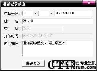 在A8電腦傳真機(jī)的電話商務(wù)通軟件主界面,雙擊通話記錄中的某個客戶號碼,或選中該號碼點(diǎn)擊下面的通話歷史按鈕,您與該客戶的通話歷史便一覽無余。選中某個記錄,您可以對其進(jìn)行編輯(添加姓名、備注該次通話的內(nèi)容),刪除,軟件撥出,加入電話簿等操作。