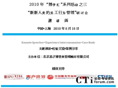 21世紀(jì)什么是貴?人才最貴!人才是企業(yè)持續(xù)發(fā)展的唯一生命之源。易才博普奧公司(CTG BPO)作為專業(yè)的人力資源外包專家、服務(wù)外包產(chǎn)業(yè)專業(yè)人才租賃供應(yīng)商,近年來在業(yè)界積累了大量?jī)?yōu)秀的一線人才租賃經(jīng)驗(yàn)并得到廣泛的業(yè)界好評(píng)!2010年伊始,易才博普奧推出了“博學(xué)匯”系列客戶交流會(huì)活動(dòng),旨在搭建一個(gè)與行業(yè)精英、業(yè)內(nèi)專家互動(dòng)交流的平臺(tái),學(xué)習(xí)、體驗(yàn)和分享多元文化,促進(jìn)和推動(dòng)彼此之間的交流與合作。