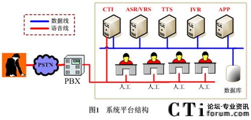 圖1是系統(tǒng)的技術(shù)平臺(tái)架構(gòu)圖。電話通過PSTN公用電話網(wǎng)進(jìn)入系統(tǒng),IVR服務(wù)與來電者自動(dòng)語音交互,來電者用語音說出想要的路政分局的名稱,系統(tǒng)ASR服務(wù)正確識(shí)別后將來電轉(zhuǎn)到相應(yīng)的路政分局,由相應(yīng)路政分局提供服務(wù)。來電者在上班時(shí)間也可以請(qǐng)求人工座席服務(wù)。