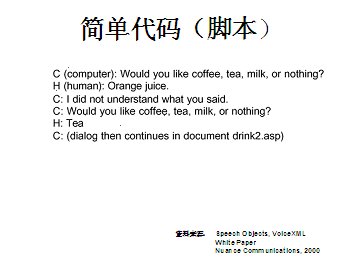 世界上最古老的用戶界面--人類語言終于在二十一世紀借助于VoiceXML,一種語音可擴展標記語言發(fā)展成熟起來。作為世界上第一個真正的語音通信標準,它定義了應(yīng)用開發(fā)商向用戶提供新型信息訪問服務(wù)的方式。通過這種服務(wù),用戶在任何地方,都可以通過電話或任何移動設(shè)備,虛擬訪問任何信息。VoiceXML正在被廣泛應(yīng)用于旅游、金融與信息服務(wù)等行業(yè)的各種業(yè)務(wù)領(lǐng)域中,甚至是政府部門與市政機構(gòu),全球的無線運營商等。