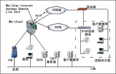 采用北電網(wǎng)絡(luò)的RemoteOffice解決方案。對(duì)于主叫用戶,與原來的撥號(hào)方案完全一樣;對(duì)于話務(wù)員座席,只是將交換機(jī)的數(shù)字座席通過廣域網(wǎng)或者專線方式連到遠(yuǎn)端。該方案在呼叫中心的PBX上安裝北電的Meridian