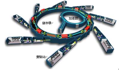 同步輻射(synchrotron radiation)是由以近光速行進的電子束在受外在偏轉磁鐵的磁力改變運動方向時所發(fā)射的電磁波。同步加速器的結構包含電子槍或離子源、線型加速器、偏轉磁鐵、真空腔、RF腔、實驗站等。電子或離子首先由電子槍或離子源激發(fā)產生,經直線加速器加速到接近光速,再通過輸送管道進入儲存環(huán)。儲存環(huán)是由許多磁鐵組成。粒子在儲存環(huán)旋轉處受到偏轉磁鐵作用發(fā)生偏轉,并在直線段持續(xù)加速以保持動能,并在儲存環(huán)中作回旋運動,同時不斷發(fā)出同步光。光束路線將同步光從儲存環(huán)引導出來,憑借內部精密的光學組件將同步光聚焦并選取合適波段的同步輻射送入實驗站?茖W研究人員在實驗站測量同步輻射經過物體反射、衍射、散射及透射后的光譜或是探測物體被光子激發(fā)出的電子、離子等,來研究物體的結構性能,探索微觀世界的奧秘。