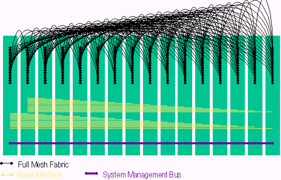 PICMG 3.0包含多種傳輸,這些傳輸模式如圖由下而上依序提供系統(tǒng)管理層、控制層、資料層等的聯(lián)接。系統(tǒng)管理是基于一條與各槽位都相連的I2C 雙串行信號線, 系統(tǒng)管理信息則是基于IPMI規(guī)范被擴展到在PICMG3.0規(guī)范中使用。系統(tǒng)管理總線也是冗余方式確保在一條總線故障情況下,管理信息仍正常傳遞。在資料層旁邊的控制層稱作Base 接口 (Base Interface),Base接口是一個雙星型的拓撲結(jié)構(gòu)具有冗余的交換刀片和以太網(wǎng)BAST-T信號,在PICMG 3.0中提供IP傳輸,這點在架構(gòu)定義上非常像PICMG 2.16。PICMG 3.0單板的高速數(shù)據(jù)傳輸是通過Fabric接口 (Fabric Interface),F(xiàn)abric接口是基于3.125Gbps SERDES信號,可以在星型和全網(wǎng)狀結(jié)構(gòu)中支持10Gb的傳輸速率。正如上面提到的,PICMG 3.0核心規(guī)范定義了Fabric接口的信號和互聯(lián),而輔助規(guī)范定義了用于傳輸?shù)膮f(xié)議。PICMG 3.0 背板的互聯(lián)支持全網(wǎng)狀Fabric接口,雙星型Base接口和冗余的系統(tǒng)管理,如下圖所示:
