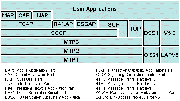 圖中MAP,CAP,RANAP,BSSAP為移動(dòng)通信系統(tǒng)使用的信令;ISUP,TUP,INAP為固定網(wǎng)使用的信令;DSS1和V5.2為接入網(wǎng)使用的信令。