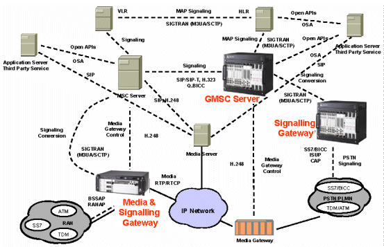 在這個(gè)例子中媒體和信令網(wǎng)關(guān)(Media & Signalling Gateway)、移動(dòng)交換中心網(wǎng)關(guān)服務(wù)器(GMSC Server)、拜訪位置寄存器(VLR)、歸宿位置寄存器(HLR)都集成了信令網(wǎng)關(guān)的功能,它們分別起到無(wú)線接入網(wǎng)的信令網(wǎng)關(guān)和漫游信令網(wǎng)關(guān)的作用。獨(dú)立設(shè)置的信令網(wǎng)關(guān)(Signalling
