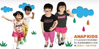 除了衣服質(zhì)感舒適,ANAP KIDS以款式流行、設(shè)計(jì)CUTE的市場(chǎng)定位也贏得 不少青睞者的追捧。更有小物件、配飾等多類商品,滿足了喜歡時(shí)尚、裝扮的母親們想讓自己孩子穿得和其他人與眾不同衣服的需求。繼承了ANAP傳統(tǒng)的ANAP KIDS是一個(gè)非!氨挤拧薄ⅰ俺錆M活力”的品牌,致力于協(xié)助父母給予最可愛(ài)的他(她)最安全、最舒適的呵護(hù),將潮流、關(guān)愛(ài)、成長(zhǎng)的生活觀念傳遞到每個(gè)家庭,讓所有3-6歲兒童共享同一份快樂(lè)。
