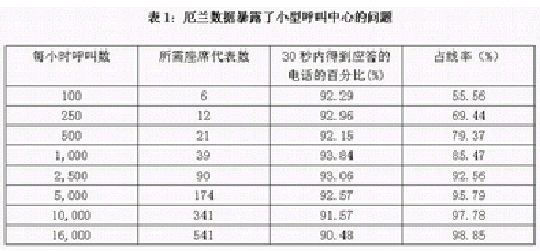 這張厄蘭表生動地說明了當呼叫中心規(guī)模增長是其效率的迅速增長。這張表對應的情況是這樣的:處理每一個呼叫的平均時間是2分鐘。要實現(xiàn)的目標是90%的呼叫要在30秒內(nèi)得到應答。第一列顯示了呼叫量的增長,第二列顯示了相對于特定的呼叫量,為達到指定的服務水平,在該厄蘭模型下所需的最少座席代表數(shù)。