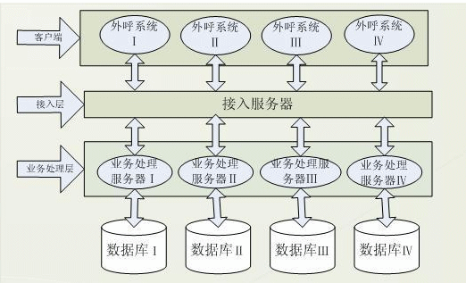 針對舊外呼業(yè)務系統(tǒng)的弊端及業(yè)務系統(tǒng)特點,賽迪呼叫研發(fā)了基于三層C/S結構的外呼業(yè)務系統(tǒng),該系統(tǒng)分客戶端,接入服務器,業(yè)務服務器及數(shù)據庫端。客戶端發(fā)送請求給分配服務器,接受到請求后,分配服務器根據客戶端的請求數(shù)據將其分配給自身的業(yè)務服務器做業(yè)務處理,這樣客戶端與業(yè)務服務器建立起聯(lián)系,結構體系如圖:
