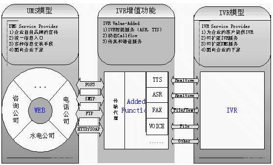 。ǘ㊣VR系統(tǒng)的傳統(tǒng)缺點是缺乏智能化,流程更改困難,播放的語音或者內容必須預先錄制.所以我們提供UMS服務,增強IVR的功能. 使我們的IVR功能增強(Ext-IVR Service Provider)
