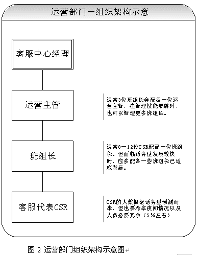 關(guān)于團(tuán)隊(duì)的建設(shè),應(yīng)該首先考慮組織架構(gòu)的設(shè)立。從運(yùn)營(yíng)角度講,設(shè)置客服中心經(jīng)理、運(yùn)營(yíng)主管、班組長(zhǎng)、客服代表都是必須的。當(dāng)然根據(jù)不同的規(guī)模,也可以增加或者減少層級(jí)。具體建議請(qǐng)見(jiàn)圖2所示。除了運(yùn)營(yíng)之外,對(duì)于大型呼叫中心(50坐席以上,或者業(yè)務(wù)較為復(fù)雜的),也應(yīng)考慮相關(guān)部門的設(shè)立。比如客戶關(guān)注組,可以負(fù)責(zé)疑難問(wèn)題解決、工單流轉(zhuǎn)、投訴處理、建議處理、知識(shí)庫(kù)建設(shè)采編等等;培訓(xùn)組可以負(fù)責(zé)管理、組織、實(shí)施員工培訓(xùn);技術(shù)維護(hù)組可以負(fù)責(zé)系統(tǒng)維護(hù)、網(wǎng)絡(luò)維護(hù)、新項(xiàng)目應(yīng)用界面開(kāi)發(fā)、部分系統(tǒng)優(yōu)化;綜合行政可以負(fù)責(zé)人事、行政等事務(wù)。