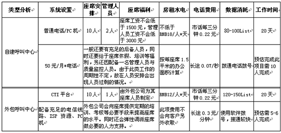 以上是以Telemarkering項目舉例,如需完成一萬條數(shù)據(jù)的外呼工作,自建呼叫中心與外包型呼叫中心的區(qū)別。以上數(shù)字只是提現(xiàn)在設(shè)備、人員效率等方面問題,另定期的人員培訓(xùn)及相關(guān)系統(tǒng)的維護將是費用產(chǎn)生的一大因素。其實在項目的實施過程中發(fā)生的費用只是一部分,從公司的運營角度看是可以節(jié)省很大的精力(例如:人員招聘、培訓(xùn)、福利待遇)及運營時間。