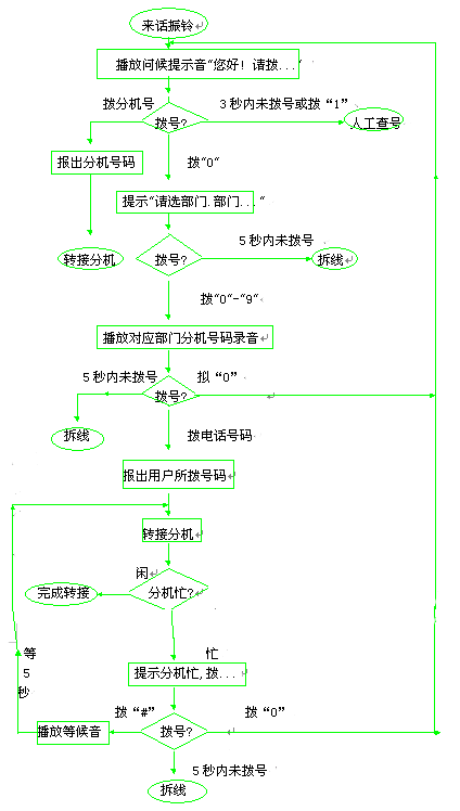 來話首先被接至自動查號接續(xù)系統(tǒng), 自動系統(tǒng)的工作流程如下: