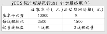 jTTS標(biāo)準(zhǔn)版在聲音質(zhì)量、聲音平滑度、自然度等方面已具有比較高的實(shí)用化水平。為了真正啟動語音技術(shù)的應(yīng)用市場,捷通華聲啟動“颶風(fēng)行動”,在活動期間為最終客戶、系統(tǒng)集成商制定了一個(gè)極具競爭力的價(jià)格,并且無平臺費(fèi)。這次活動主要針對CTI領(lǐng)域中大量中小型系統(tǒng)的應(yīng)用開展此次活動,目的是讓先進(jìn)的技術(shù)能夠被更多的用戶采用,為系統(tǒng)集成商應(yīng)用TTS技術(shù)提供了很高的利潤空間。