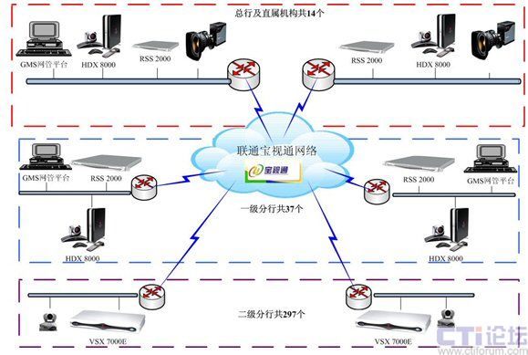 接入層:以視頻終端為主,包括總行、一級(jí)分行、總行直屬機(jī)構(gòu)共51臺(tái)POLYCOM HDX 8000高清視頻終端,全國(guó)二級(jí)分行共297個(gè)POLYCOM