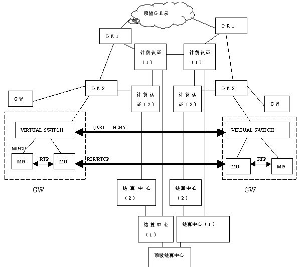 其中頂級網(wǎng)守云可以包含多個(gè)頂級網(wǎng)守,頂級網(wǎng)守之間的連接、一級網(wǎng)守與頂級網(wǎng)守之間的連接以及不同運(yùn)營者之間的連接由各運(yùn)營者根據(jù)各自的情況自行確定其具體的連接方式。當(dāng)IP電話運(yùn)營者的網(wǎng)絡(luò)規(guī)模不是很大時(shí),頂級網(wǎng)守的功能可由其中一個(gè)一級網(wǎng)守完成。
