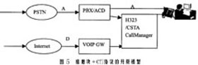 比較有代表性的解決方案有兩種,一種是效仿圖1的做法,在ACD的用戶側(cè)加入VoIP網(wǎng)關(guān),再統(tǒng)一接入(如圖4所示);另一種方法是采用價格比較便宜的IP座席卡,并在Call Manager中加入CTI的有關(guān)協(xié)議模塊(如圖5所示)。