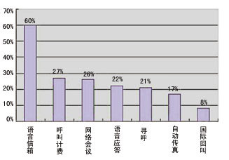 從企業(yè)所使用的CTI應用服務來看:最多的是語音信箱(Voice Mail)為 60%。呼叫計費(Call Accounting)為27%,網(wǎng)絡會議(Conferencing)為26%。語音應答(IVR)為22%。由于CTI在我們國家,這一兩年才得到比較快的發(fā)展,所以應用層次還不是很高。還有一個原因是有些CTI技術的應用在發(fā)展企業(yè)的核心業(yè)務方面作用不大,所以像Audio TEX、Powers Dialers等一些應用就比較少。