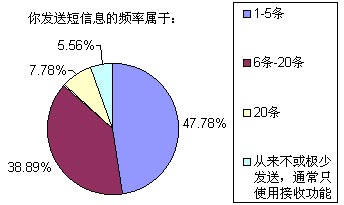 以上選擇中,選擇答案A~E的被訪者比例分別為18.89%、6.67%、25.56%、37.78%和11.11%,也就是說(shuō)我們這次調(diào)查的重頭是放在一般收入水平和無(wú)收入(學(xué)生)兩類人群,這兩個(gè)人群也正是SMS市場(chǎng)上最活躍的分子。高收入和低收入人群要么因?yàn)橘Y金充裕而選擇語(yǔ)音業(yè)務(wù),要么就是因?yàn)橘Y金的缺乏而盡量不使用移動(dòng)通信方式。