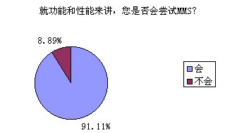 題8的調(diào)查結(jié)果對(duì)于中國(guó)移動(dòng)來(lái)講絕對(duì)是充滿誘惑的,高達(dá)91.11%的被訪者表示他們非常愿意嘗試MMS的功能和服務(wù),無(wú)疑這對(duì)ICP們(MMS服務(wù)的重要載體)也是一針強(qiáng)心劑啊!