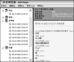 MSN Helper啟動(dòng)時(shí)會(huì)自動(dòng)啟動(dòng)MSN,可以看到在MSN的菜單欄上多了一個(gè)“助手”菜單。在這里“打開歷史瀏覽器”,就可以輕松地查看聊天記錄啦(如圖1)。如果覺(jué)得某些聊天的內(nèi)容比較重要,在右邊的記錄窗口里拖選中這些記錄,然后單擊“文件”菜單,將聊天記錄保存或打印出來(lái)。
