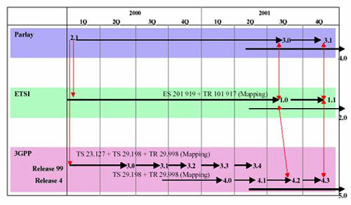 1998年4月,Parlay工作組成立,成員主要有英國(guó)電信、Ulticom 、微軟 、北電 、西門子組成,并于1998年12月出版提出最初的版本。Parlay工作組的目標(biāo)是通過(guò)規(guī)范開放應(yīng)用程序接口,聯(lián)合IT應(yīng)用和通信應(yīng)用的開發(fā)能力,促使通信應(yīng)用數(shù)量的飛速發(fā)展。1999年5月,隨著AT&T、Cegetel、Cicso、Ericsson、IBM和Lucent等6個(gè)新成員的加入,成員總數(shù)增加至共11名。2000年1月API2.0出版,僅6個(gè)月后,API2.1出版。在2001年2月,Parlay工作組成員增加至37個(gè),并推出Parlay3.0。Parlay