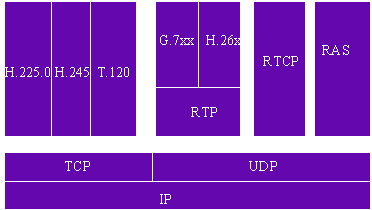 H.323是一個(gè)框架性協(xié)議,它是由系列協(xié)議組成的,圖5列出了H.323棧的基本內(nèi)容。