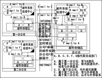 · F mail to A:F發(fā)郵件給A,此郵件經(jīng)由Internet發(fā)到總公司A的信箱中,因?yàn)橛蛎潜唤忉尩娇偣镜姆⻊?wù)器上,第一分公司的服務(wù)器會(huì)定時(shí)將總公司A信箱中的郵件取回,所以對(duì)A來(lái)講,F(xiàn)發(fā)來(lái)的郵件就好像是直接遞送到本公司的服務(wù)器上一樣。