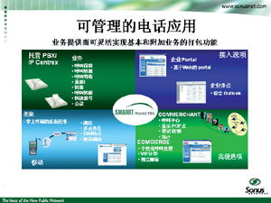 針對IP CENTREX應(yīng)用,Sonus公司可提供名為Sonus SMARRT Hosted PBX的解決方案。該方案可支持現(xiàn)有的電話基本業(yè)務(wù)和補(bǔ)充業(yè)務(wù),為終端用戶和管理者提供基于Web的服務(wù)及與Outlook集成的客戶端系統(tǒng);跇(biāo)準(zhǔn)的接口,該方案還集成了支持運營商OSS系統(tǒng)的工具。