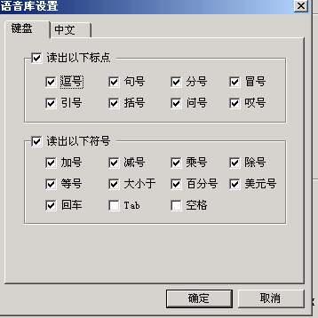 如果需要進(jìn)一步的調(diào)整,可以選擇菜單里的“設(shè)置……”。打開設(shè)置窗口(如圖3)。窗口共分四個(gè)選項(xiàng),每個(gè)選項(xiàng)里除了剛介紹的幾種常用功能調(diào)整外,還可以控制歡迎畫面、開始畫面、設(shè)定存儲(chǔ)等功能,規(guī)定提示速度、朗讀速度的快慢,選擇提示方式,設(shè)定提示報(bào)警條件。在“語音庫”選項(xiàng)中還可以選擇朗讀為男聲還是女聲。單擊“設(shè)置”按鈕,可以根據(jù)具體需要選擇“鍵盤”或“中文”里被朗讀標(biāo)點(diǎn)符號(hào)的種類(如圖4)。