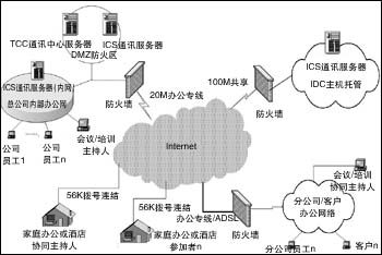 在實(shí)際建立的系統(tǒng)中,采用了公司內(nèi)部3臺(tái)服務(wù)器。一臺(tái)ICC主要用作登錄認(rèn)證及用戶和服務(wù)器管理;2臺(tái)ICS服務(wù)器,一臺(tái)布置在防火區(qū),供外網(wǎng)用戶的訪問,一臺(tái)在內(nèi)網(wǎng),供公司內(nèi)部員工使用。在公司外面,托管了一臺(tái)ICS(通訊服務(wù)器),供公司外部用戶訪問。