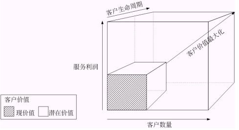 圖二 : 客戶(hù)價(jià)值與客戶(hù)數(shù)量、服務(wù)利潤(rùn)和客戶(hù)生命周期的關(guān)系