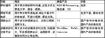 從結(jié)構(gòu)上,軟件視頻產(chǎn)品基本分為兩大類:一類是點對點,另一類是一點對多點。點對點產(chǎn)品僅限于兩人之間的交流,此類典型產(chǎn)品有微軟的MSN和NetMeeting、Yahoo的雅虎通、QQ等;一點對多點產(chǎn)品用于多方的實時交流,此類產(chǎn)品是各種軟件解決方案的軟件視頻會議產(chǎn)品,如:北京捷先科技的WorldStar、威速公司的V2等。根據(jù)用途的不同,軟件視頻產(chǎn)品大致分為即時通訊產(chǎn)品(如MSN和NetMeeting、雅虎通、QQ)、網(wǎng)絡(luò)可視電話產(chǎn)品、視頻會議產(chǎn)品(如:V2)、多媒體實時交流平臺產(chǎn)品(如:WorldStar、WebEx、Interwise等),分類如表。