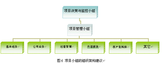 。。4.2 成立共同的項目小組,盡可能分模塊負責。需求方一個項目小組,開發(fā)方一個項目小組,雙方派出項目經(jīng)理的方式往往不能滿足Call Center這樣復雜的系統(tǒng)需要。建議雙方建立共同的項目小組,充分溝通與合作,控制項目的范圍和質量。圖6 是項目小組的建議。
