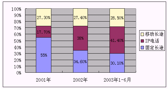 從圖上看,移動長途占整個長途通話比重增長緩慢,IP長途所占比重上升較快,已由2001、2002年的17.7%、38%上升到41.4%,與此相反,傳統(tǒng)固定長途所占比重下降較快,由2001年占整個長途通話的55%,迅速下降到目前的30.1%。隨著移動長途、IP長話的異質競爭加劇,大量分流了傳統(tǒng)固定長途,2003年1-6月傳統(tǒng)固定長途中國內(nèi)長途、國際及港澳臺通話時長比上年同期分別下降0.6%、6.4%、13.9%。