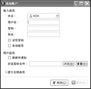 選擇協(xié)議:在“協(xié)議”下拉列表框中選擇你要使用的即時(shí)通訊工具名稱,例如這里我們準(zhǔn)備添加一個(gè)MSN賬號,那么就選擇“MSN”協(xié)議;如果是添加ICQ賬號,那么應(yīng)該選擇“AIM/ICQ”協(xié)議。