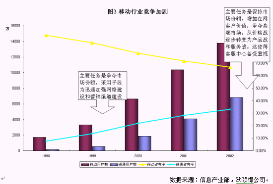 拿移動通訊業(yè)務來說,如圖3所示,截至到2002年底,中國移動的市場份額大約在65%,而聯(lián)通為35%左右,網(wǎng)絡覆蓋以及質(zhì)量也越來越趨同。從國內(nèi)國外的經(jīng)驗來看,移動通訊市場的競爭正從爭奪市場份額轉(zhuǎn)變?yōu)楸3质袌龇蓊~和增加客戶價值,而主要手段正也從網(wǎng)絡建設、營銷渠道建設、價格戰(zhàn)等轉(zhuǎn)變?yōu)楫a(chǎn)品戰(zhàn)和服務戰(zhàn)。在這個階段,兩家主要的運營公司都對客戶服務非常重視。服務水平的達標,投訴流程的梳理,呼叫中心的擴大規(guī)模,電話營業(yè)廳的建設等工作是今年的重點。