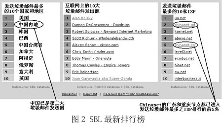圖2是國際上著名的反垃圾郵件組織Spamhaus在網(wǎng)站上列出的統(tǒng)計(jì)排行榜,“China”已經(jīng)穩(wěn)居第二大垃圾郵件發(fā)送國的位置,而右邊的一個(gè)排行榜則從另一個(gè)角度向我國敲響了警鐘——在專為發(fā)送垃圾郵件的ISP所列的黑名單SBL中,我國Chinanet的兩個(gè)省級(jí)ISP在前10名中分列第2和第5名。而Chinanet作為中國的公用信息互聯(lián)網(wǎng)絡(luò),是我國的Internet骨干網(wǎng),是國內(nèi)用戶接入互聯(lián)網(wǎng)的主要途徑之一!拔覀冋娌幌M赃@樣的方式‘揚(yáng)名海外’”,來自一家ISP的一位不肯透露姓名的女士說,“其實(shí)我們也是受害者!”