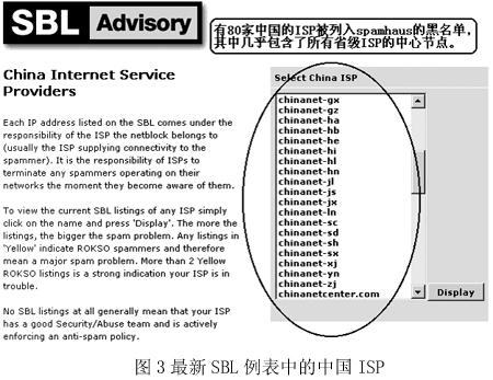 垃圾郵件損害的不只是中國的國際形象,中國反垃圾郵件聯(lián)盟的葉豪告訴記者,類似SBL(更一般的是RBL,即“實(shí)時(shí)黑名單”)這樣的服務(wù)是由國外的一些公司或第三方組織提供的,目前已經(jīng)成為國際上比較通行的防范垃圾郵件的措施。而在具備較高知名度的Spamhaus所維護(hù)的這份黑名單中,我國的ISP竟然多達(dá)80家(如圖3),幾乎所有的省級(jí)ISP都位列其中。“中國很多大的ISP都在不同的‘黑名單’里,從這些國內(nèi)ISP發(fā)出的郵件,那些用‘黑名單’的客戶根本就收不到。現(xiàn)在‘黑名單’是比較好用的一種辦法,所以使用‘黑名單’服務(wù)的企業(yè)也越來越多,國際上針對(duì)中國的信息壁壘就越來越厲害,再不采取措施,中國就等著被全世界‘封掉’吧!”