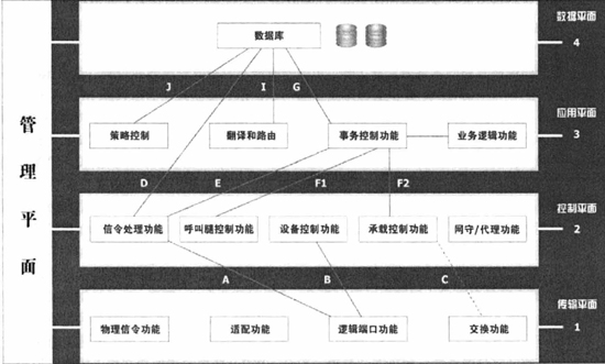 控制平面處于第二層,提供控制功能,如信令處理、承載連接控制、設(shè)備控制、呼叫腿(Leg)控制、網(wǎng)守(Gatekeeper)和代理信令等功能。其中:參考點(diǎn)D位于信令處理功能和數(shù)據(jù)庫(kù)功能之間,采用TCAP信令;參考點(diǎn)E在信令處理功能和會(huì)話控制功能之間,采用TCAP信令,用于IN請(qǐng)求等傳送,業(yè)務(wù)邏輯對(duì)呼叫的控制等消息傳送;參考點(diǎn)F1、F2分別采用呼叫控制API和承載連接控制API,如TAPI、JTAPI等。控制平面與外界的接口2采用H.323(H.225/H.245)、SIP、TCAP(TCAP/SCCP/M3UA/SCTP/IP)等協(xié)議和信令。